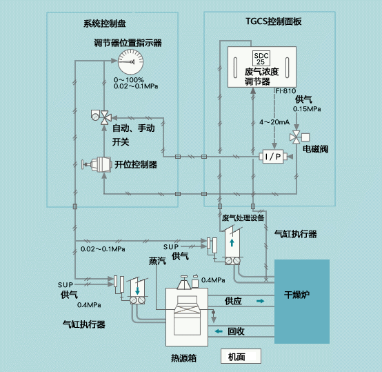 在这个项目中,基于理研计器株式会社的光波干涉式浓度指示调节器,我们成功的开发出新的系统,称为TGCS[ted废气浓度控制系统],可以自动检测废气内含有的溶剂浓度并且自动控制闸门,